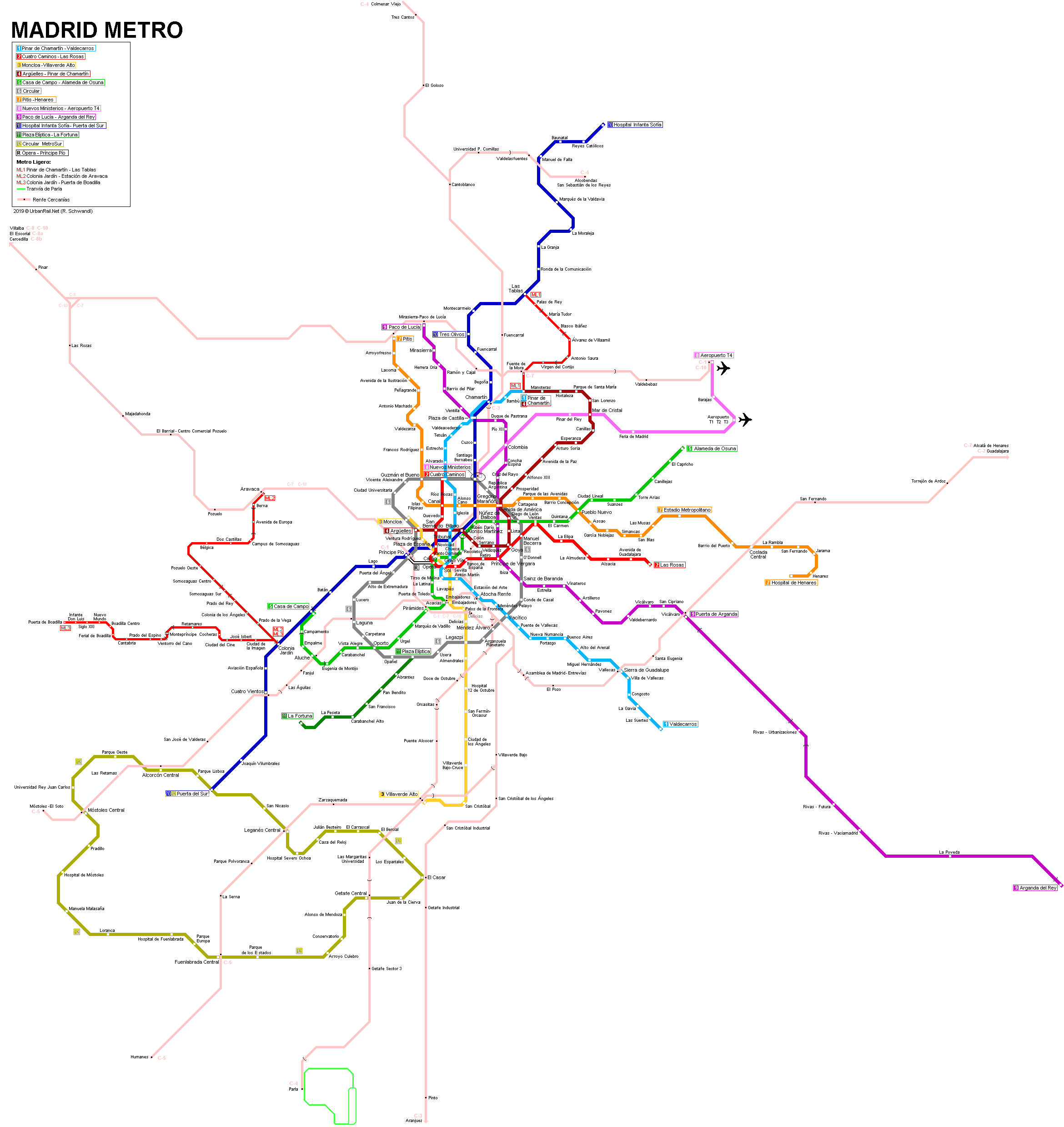 Voor een enkele reis met de metro betaal je zo’n 2,50 euro. Een tienrittenkaart is wat voordeliger dan losse kaartjes. Naar het vliegveld ben je gemiddeld zo’n 5 euro per persoon kwijt. Het metrostelsel van Madrid telt meer dan 300 stations, is 294 kilometer lang. Dagelijks maken zo’n drie miljoen mensen gebruik van de ondergrondse. Net als in Londen hebben de metrolijnen verschillende kleuren. Plattegrond: https://www.metromadrid.es/export/sites/metro/comun/documentos/planos/Planoesquematicoingles.pdf